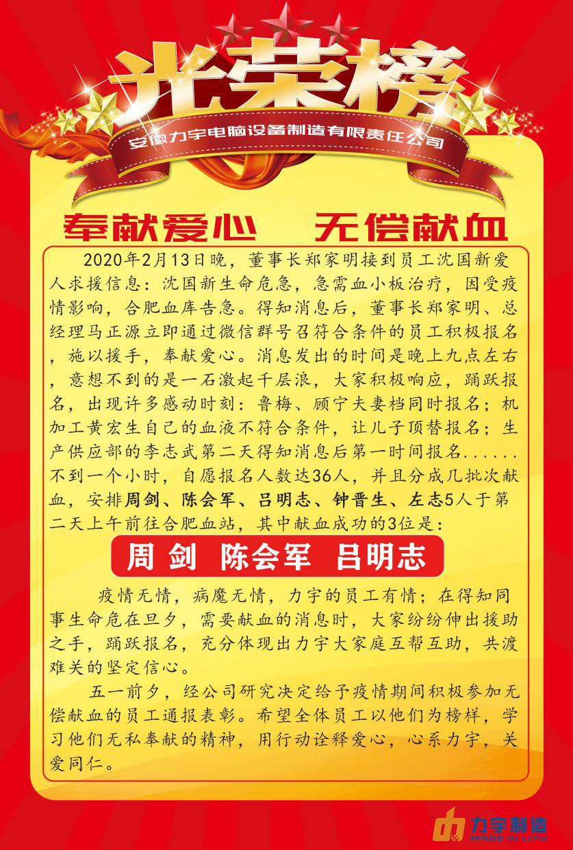 五一前夕,經公司研究決定給予疫情期間積極參加無償獻血的員工通報表彰。希望全體員工以他們為榜樣,學習他們無私奉獻的精神,用行動詮釋愛心,心系力宇,關愛同仁。